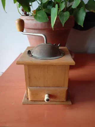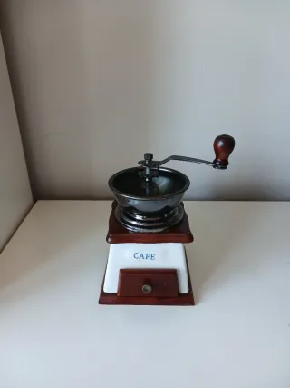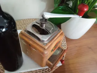 Molinillo de café de estilo antiguo, con un diseño clásico que evoca épocas pasadas. - Base de madera oscura. - Mecanismo de manivela superior. - Cajón extraíble para el café molido.