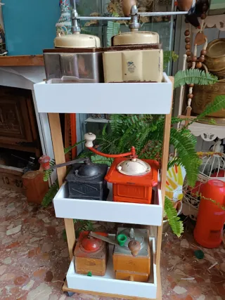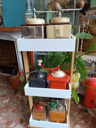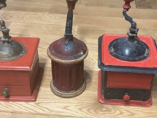 1 por 8€ 3 por 20€ Conjunto de tres molinillos de café antiguos con un diseño clásico. - Cuerpo principal en color rojo. - Mecanismo de molienda manual con manivela. - Detalles metálicos y de madera.
