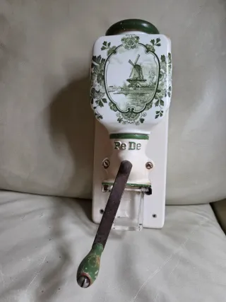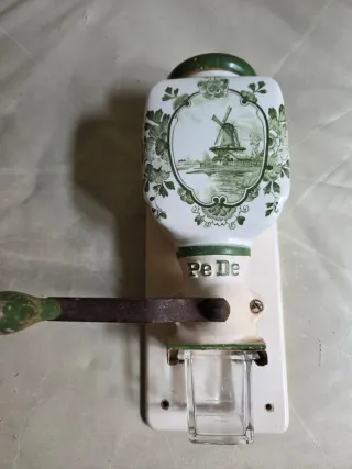 Molinillo de café de pared antiguo de la marca alemana PeDe (Peter Dienes). Cerámica holandesa Delft.