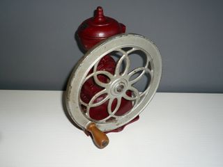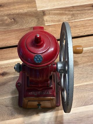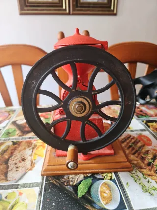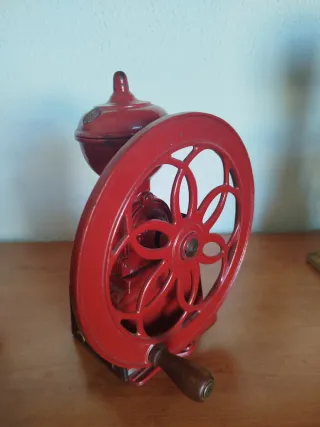 Molinillo de café de estilo antiguo con un llamativo acabado en color rojo. - Cuerpo principal de metal pintado en rojo. - Rueda plateada con diseño decorativo. - Mango de madera para operar el molinillo.