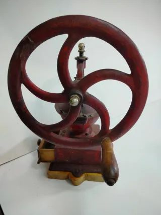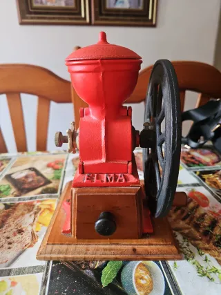 Antiguo molinillo de café manual, pintado en rojo. Elma fabricó estos molinillos en 1930. - Fabricado en hierro fundido. - Mecanismo de molienda visible. - Incluye manivela lateral.