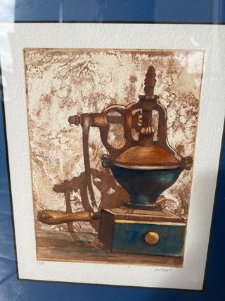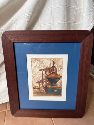 Bonito grabado de un molinillo de café antiguo, con un marco de madera oscura. - Representación detallada de un molinillo clásico. - Montado sobre paspartú azul. - Marco de madera oscura. Medida 40 cm por 45 cm