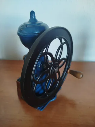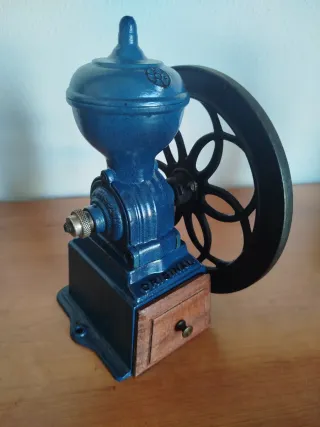 Molinillo de café antiguo marca JMF. Molino de cafe antiguo de hierro fundido. Restauración de pintura. Azul y negro