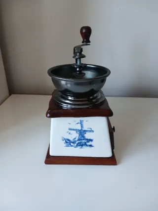 Molinillo de café vintage con un diseño decorativo de molino y paisaje holandés. - Cuerpo de cerámica con pintura azul. - Mecanismo de molienda de metal. - Manivela de madera. - Cajón recolector de cristal.