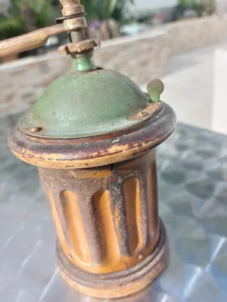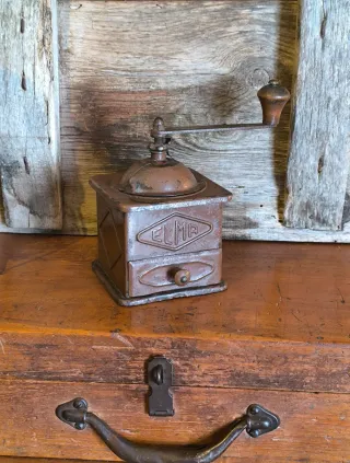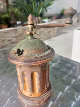 Molinillo de café vintage, con un diseño clásico y robusto. Ideal para coleccionistas o para dar un toque retro a tu cocina. - Cuerpo metálico con acabado oxidado. - Manivela superior para moler. - Cajón inferior para el café molido.