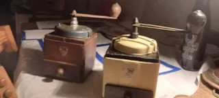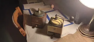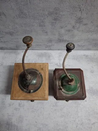 Conjunto de dos molinillos de café antiguos, con un diseño clásico y un acabado que evoca épocas pasadas. - Uno de los molinillos presenta un acabado en color verde. - El otro molinillo tiene un acabado en color ocre. - Ambos muestran signos de óxido, lo que acentúa su carácter vintage.