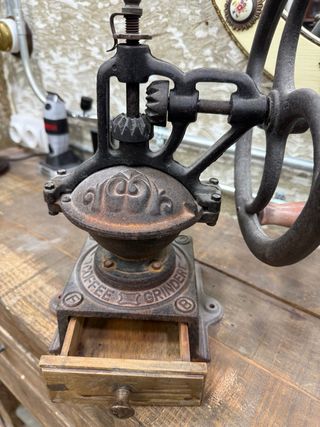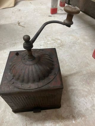 Molinillo de café vintage, con un diseño clásico. Ideal para coleccionistas o para añadir un toque retro a tu cocina. - Cuerpo metálico con acabado en óxido. - Cajón extraíble para el café molido. - Manivela manual para moler. - Para restaurar