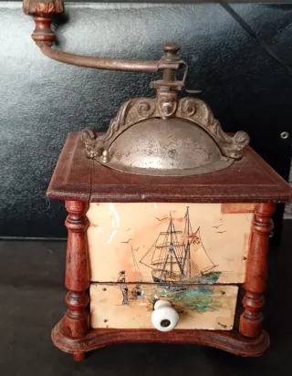 Molinillo de café antiguo con un diseño único y decorativo, altura de 24 cm anchura de 15 cm, funciona perfectamente. - Cuerpo de madera con paneles ilustrados. - Ilustración de un barco de vela y escena marina. - Mecanismo de molienda con manivela. - Cajón extraíble con pomo de cerámica.