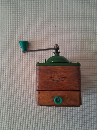 Molinillo café antiguo marca Elma de chapa y el tirador de madera, funciona aunque es ideal para decoración. Alto 14,5 hasta la manivela y 10,5 ancho.