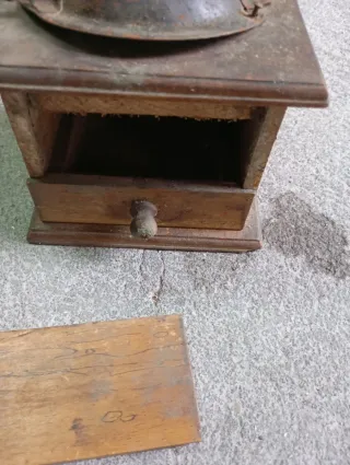 Este objeto es un molinillo de café antiguo de estilo vintage, caracterizado por una base de madera con acabado envejecido y un mecanismo metálico superior con manivela. Estructura: Cuenta con un cuerpo cúbico de madera, frecuentemente repintado o con aspecto desgastado, y una tapa metálica superior. Funcionamiento: Incluye una manivela metálica en la parte superior para accionar el mecanismo de molienda interno. Almacenamiento: Dispone de un pequeño cajón frontal extraíble para recoger el café molido. Estado: Es común encontrar estos objetos con muestras de óxido en el metal o desgaste en la madera, lo que resalta su antigüedad
