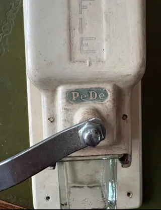 Molinillo de café de pared de la marca holandesa-alemana PeDe (Peter Dienes). Estos molinillos fueron muy populares en la década de 1930. Fabricado por PeDe, una empresa fundada por Peter Dienes. Este modelo específico se asocia con la marca de café holandesa Douwe Egberts (D.E.), ya que se vendía frecuentemente en sus tiendas de regalos. Cuenta con un cuerpo de cerámica color crema. una manivela de metal y recipiente de vidrio