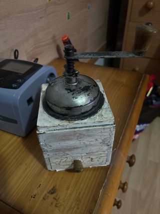 Molinillo de café vintage con cuerpo de madera y detalles metálicos. Un objeto con carácter para tu cocina. - Cuerpo principal de madera. - Mecanismo de molienda metálico. - Cajón extraíble para el café molido. Escucho ofertas no hago enviod