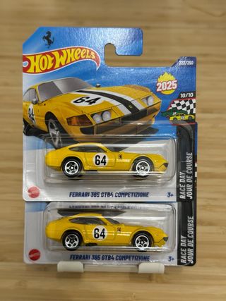 Dos coches Hot Wheels del modelo Ferrari 365 GTB4 Competizione en color amarillo. - Escala 1:64. - Diseño de carreras con el número 64. - Parte de la colección 2025, serie 10/10. - Edición especial Race Day. SE PUEDEN SEPARAR