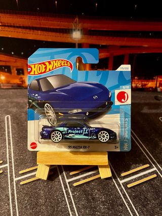 Coche de colección Hot Wheels, modelo Mazda RX-7 del año 1995. - Color azul con detalles 'Project μ'. - Parte de la serie HW J-Imports. - Escala 1/10.