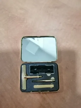 Práctica maquinilla de viaje de la colección MD. - Diseño compacto y elegante. - Material de cuero.