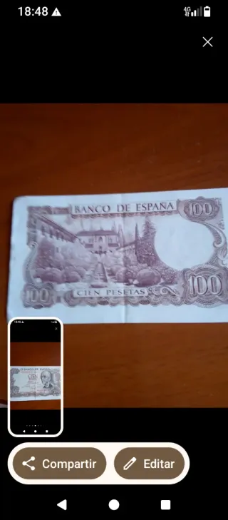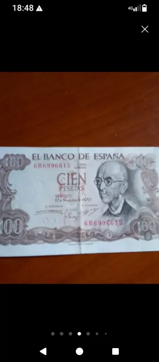 Billete de 100 pesetas del Banco de España con fecha de 1970. El diseño incluye un retrato de un hombre con gafas. - Serie: 6B6996615 - Fecha de emisión: 17 de Mayo de 1970 - Lugar de emisión: Madrid