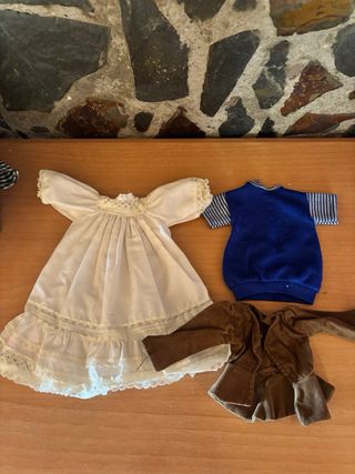 Conjunto de ropa para muñeca Nancy clásica. - Vestido de crochet naranja y blanco. - Pantalón rosa con lunares blancos. - Vestido blanco con falda de cuadros marrones. - Botas color camel. - Caja de zapatos Nancy. - 5 euros por pieza