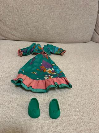 Conjunto de ropa para Nancy, modelo Maxi Hungara. -Estilo geisha muy dificil de encontrar -Tiene un pequeño agujero - Incluye top y falda con estampado floral. - Colores verde, rosa, morado y naranja. - Incluye par de zapatos verdes.