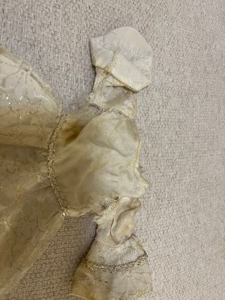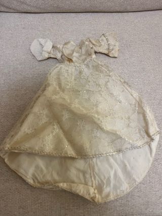 Vestido de boda para Nancy de Famosa, ideal para coleccionistas o para restaurar. - Diseño de encaje con detalles brillantes. - Mangas abullonadas. - Requiere restauración.