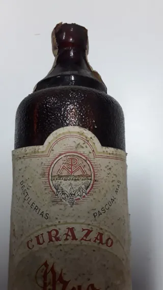 Botella de licor Curazao de las destilerías de Pascual Mas. Molins de Rei. - Etiqueta con diseño vintage. - Destilerías Pascual Mas. - Muy antigua. - Para Coleccionistas. - La botella se vende ESCLUSIVAMENTE por el valor de colección, no por el CONTENIDO (Que no se puede tragar) No se aceptan cambios ni devoluciones. Precio no negociable. HACEMOS ENVÍOS. *Pago por wallapop o bizum.