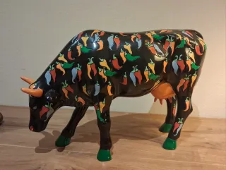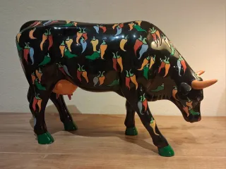 Se Vende Figura decorativa de vaca cerámica Cow Parade con un diseño original y llamativo de pimientos - Base negra con estampado de chiles de colores. - Cuernos y ubres en tono naranja. - Pezuñas pintadas de verde. - Diseño estsmpado - Medidas: Altura 18 cm x 27 cm Largo x 7 cm Ancho. - Es una pieza elegante que encaja en cualquier ambiente de la casa y no deja indiferente a nadie. -SI ENVÍOS.Precio Final.