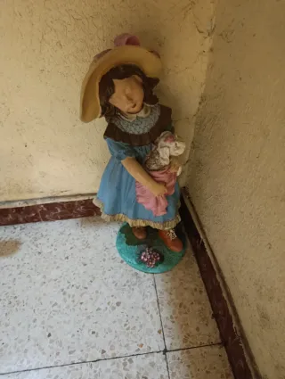 Figura decorativa de una niña con sombrero y un conejito. - Muñeca de porcelana. - Diseño detallado con vestido azul y sombrero amarillo. - Base decorada con flores.