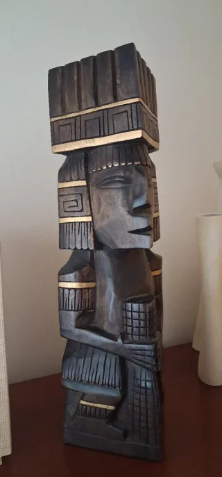 Figura antigua de madera tallada estilo maya.