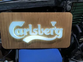 Letrero luminoso con el logo de Carlsberg. - Diseño retro con acabado de madera. - Iluminación cálida.