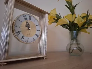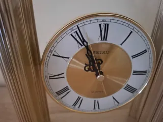 Elegante reloj de sobremesa de la marca Seiko, en perfecto estado. - Diseño clásico con números romanos. - Marco metálico plateado. - Esfera dorada. - Movimiento de cuarzo.