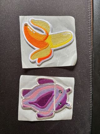 Lote de pegatinas de tela exclusivas del MWC26. Son ideales para personalizar ropa o accesorios. - Diseño de donut con glaseado blanco y sprinkles. - Diseño de Rick Sanchez con fondo verde. - Diseño de plátano pelado. - Diseño de Android verde. - Diseño de pez con mosaico de colores. - Diseño de pez morado y rosa. - 2€ / unidad