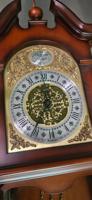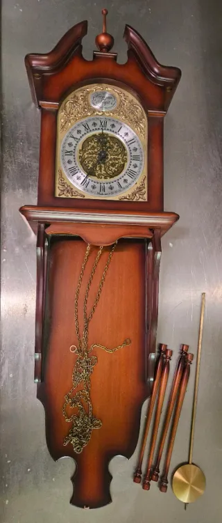 Elegante reloj de pared con caja de madera y detalles dorados. - Mecanismo de péndulo y cadenas. - Esfera con números romanos. - Incluye péndulo y pesas.