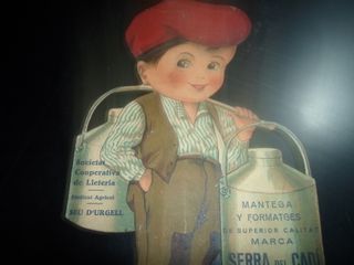 Figura publicitaria antigua de la marca Cadi-Seu D'Urgell. - Representa a un niño portando cubos de leche. - Texto en catalán: Societat Cooperativa de Lleteria, Mantega y Formatges de Superior Calitat, Serra del Cadi. - Estilo retro de los años 40/50. 24X15CM-CARTON DURO