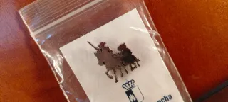 Pin de metal con diseño de turismo de Castilla-La Mancha. - Representa a Don Quijote y Sancho Panza. - 1 unidad
