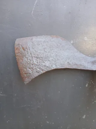 Hacha antigua de estilo catalán, de gran tamaño y con mango de madera. - Hoja de metal con acabado rústico. - Mango de madera con tratamiento. - Diseño tradicional.