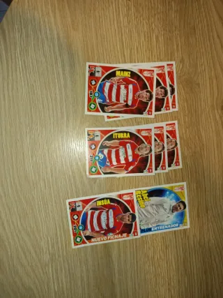 Colección de cartas de fútbol de la temporada 2014-2015. - Carta Deulofeu - Carta Denis Suárez (x2) - Carta Gorka Iraizoz - Carta Carriço - Carta Aleix Vidal - Carta Banega - Carta Dúos Imparables
