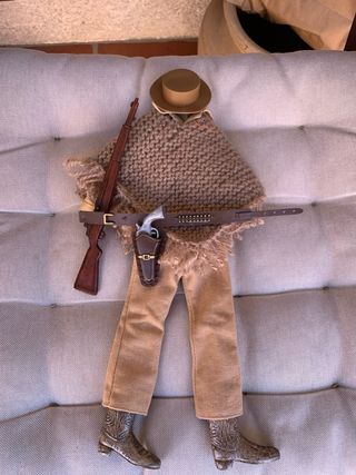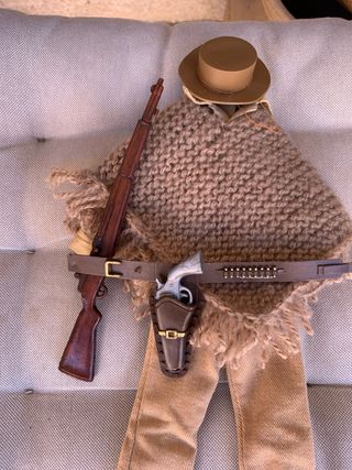 Uniforme atuendo valido para geyperman con temática western. - Incluye sombrero, poncho tejido, pantalón y botas. - Accesorios: rifle, cinturón con funda y pistola.