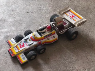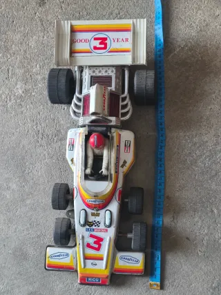 Réplica de coche de Fórmula 1 de la marca Rico. Presenta un diseño inspirado en los coches de competición de la época. - Decoración con logos de Goodyear y el número 3. - Detalles de patrocinadores como S.E.V. Marchal y Champion. - Figura del piloto con casco rojo. Juguete antiguo, coleccionista, comansi, bici, consola, Nintendo , play, PlayStation, sega, oferta, oportunidad, regalo, madelman, gijoe, motu, Nancy, famosa, hotweels, gisval, Tente, Lego, scx, Scalextric, exin, ninco, Gozan, Guisval, descatalogado, joya, plata, oro