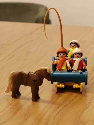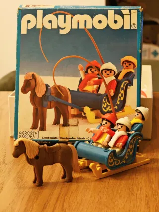 Set de Playmobil 3391 Trineo con 3 niños. - Incluye trineo azul con detalles dorados. (faltan piezas sujeción caballo) - Tres figuras de niños con ropa de invierno. (uno de los gorros no es el original) - Un caballo marrón con crin clara.