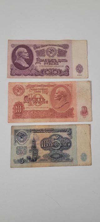 Conjunto de tres billetes de la Unión de Repúblicas Socialistas Soviéticas (URSS). - Incluye billetes de 5, 10 y 25 rublos. - Diseños con retratos de Lenin y monumentos emblemáticos. - Ideal para coleccionistas de numismática. Lote de 3 billetes URSS 25 RUBLOS 10 RUBLOS 5 RUBLOS Unión Soviética Año 1961 CIRCULADOS Bien conservados. Billetes mundo monedas biglietto pesetas francos Indonesia unión Soviética Venezuela bolívares rublos Camboya euros Moneda euros conmemorativa lote billetes ptas duros agujero numismatica francos pesetas Alemania Italia billet luxemburgo Países bajos Grecia Bélgica Francia Alemania Inglaterra Ch
