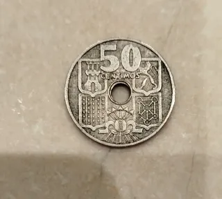 Moneda antigua española de 50 céntimos. - Diseño con escudo y detalles. - Agujero central característico.