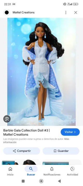 Muñeca Barbie de la colección Gala, modelo Blue Sensation. - Vestido largo azul brillante. - Acompañada de un chal de pelo sintético. - Incluye accesorios como pendientes y pulsera. En su caja de Mattel Creation