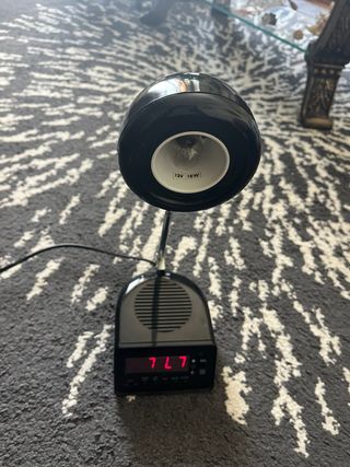 Este es un reloj despertador con una lámpara incorporada. El diseño es moderno y funcional. - Lámpara con bombilla de 12V 15W. - Pantalla digital roja. - Altavoz integrado.