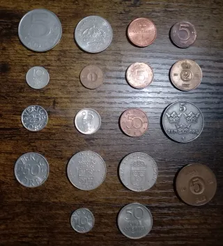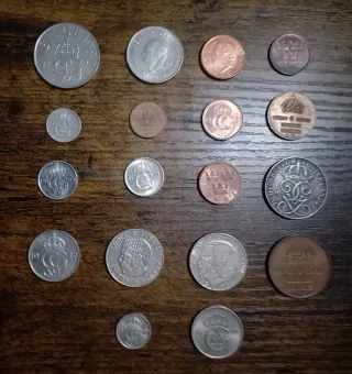 Lote de 18 monedas suecas, todas ellas distintas entre sí. Algunas muestran el escudo de Suecia, otras el valor en coronas o öre. Monedas circuladas, ver bien las fotos, son las que mando.