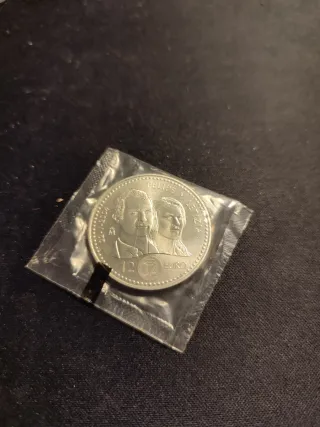 Conjunto de tres monedas de 50 pesetas de España. Se venden por unidad o como lote. - Diseño conmemorativo. - Borde ondulado. - Acabado metálico plateado.