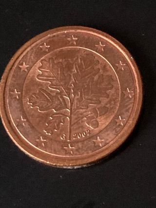 Moneda de 1 céntimo de euro de Alemania. - Año de acuñación: 2002. - Marca de ceca: G (Karlsruhe). - Diseño: Rama de roble con hojas y bellotas.