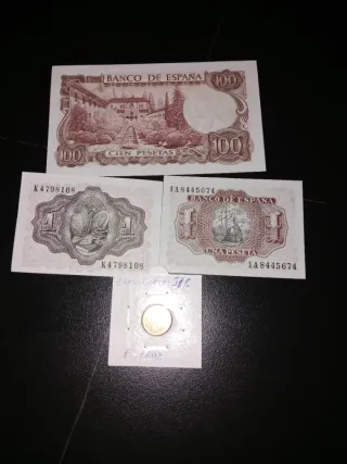 Lote de coleccionismo numismático. - Tres billetes de pesetas en estado SC (Sin Circular). * 100 pesetas 1970 sin circular * 1 peseta 1951 sin circular * 1 peseta 1953 sin circular - Una moneda de 1 céntimo de España del año 1999 en estado SC .