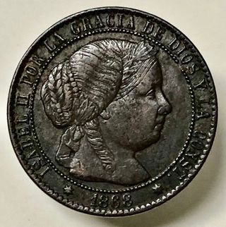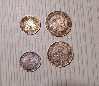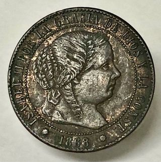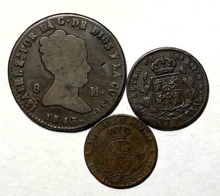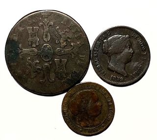 Lote de 3 monedas de Isabel II. 8 maravedís: 1843 Segovia 10 céntimos de real: 1859 Segovia 1 céntimo de escudo: 1868 Solo los 10 céntimos de real aquí se venden por 35 €.. Si se compran dos o más lotes de monedas o billetes, se aplicará descuento del 20%. Se pueden juntar este lote con otros lotes de monedas y billetes y crear un lote a medida o vender sueltas.