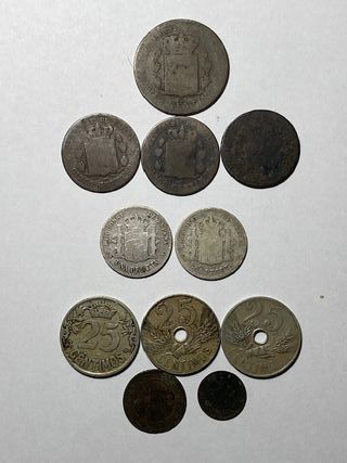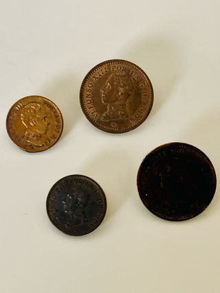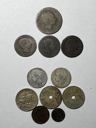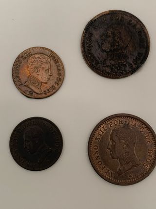 Lote de monedas españolas de Alfonso XII y Alfonso XIII. Alfonso XII 10 céntimos: 1878 5 céntimos: 1878 (2) y 1879 Alfonso XIII 1 peseta: 1900 (2 unidades) (son de plata y, segun Ucoin, pesan 5 g cada una y su valor de fusión es de casi 6 € cada una) 25 céntimos: 1925 25 céntimos: 1927 (2 unidades) 2 céntimos: 1904 1 céntimo: 1906 SLV Si se compran dos o más lotes de monedas o billetes, se aplicará un 20% de descuento o vender sueltas. Se pueden juntar este lote con otros lotes de monedas y billetes y crear un lote a medida.