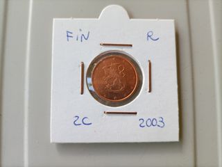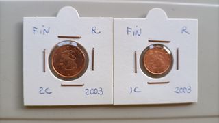 monedas de 1 céntimo y de 2 céntimos de Finlandia 2003, en buen estado, ver fotos.