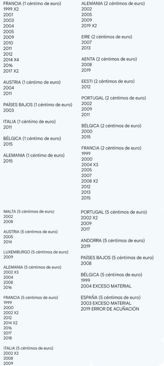 Monedas de 1, 2 y 5 céntimos de euro españolas. FRANCIA (1 céntimo de euro) 1999 X2 2001 2003 2004 2005 2009 2010 2011 2012 2014 X4 2016 2017 X2 AUSTRIA (1 céntimo de euro) 2004 2011 PAÍSES BAJOS (1 céntimo de euro) 2003 ITALIA (1 céntimo de euro) 2011 BÉLGICA (1 céntimo de euro) 2015 ALEMANIA (1 céntimo de euro) 2015 ALEMANIA (2 céntimos de euro) 2002 2005 2009 2019 X2 EIRE (2 céntimos de euro) 2007 2013 AENTA (2 céntimos de euro) 2008 2019 EESTI (2 céntimos de euro) 2012 PORTUGAL (2 céntimos de euro) 2002 2009 2011 BÉLGICA (2 céntimos de euro) 2000 2015 FRANCIA (2 céntimos de euro) 1999 2000 MÁS DISPONIBLES EN FOTO